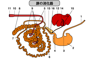 消化管の中でいちばん終わりの部分で盲腸(もうちょう)、結腸(けっちょう)、直腸(ちょくちょう)の三つの部分からなりたっています。豚の大腸は小腸にくらべると著しく太く、長さは約4-4.5mです。これは豚が雑食性動物といっても、植物性のものが多く、草食性の性格が強いためです。結腸の最初の部分は盲腸と同じくらいの太さですが、だんだんと細くなりながら、円錐(えんすい)状に3-4回左回転した後、右回転して直腸に移行します。この結腸の回転は豚の特徴です。豚の大腸にはたくさんの細菌が存在し、小腸で消化されなかったエサ、とくに繊維類は細菌がもっている種々の酵素(こうそ)で消化します。