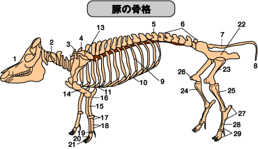脊柱は53-57個の椎(つい)骨によって構成され、脊椎(せきつい)とも呼びます。その中の胸椎は肋骨および胸骨とともに結合して胸廓(きょうかく)を形成し、心臓や肺を保護します。豚の脊柱は頸(けい)椎(7個)、胸椎(15-16個)、腰椎(6個)、仙椎(5個、骨化して1個)および尾椎(20-23個)からなり、体を縦に走って、体を支えます。