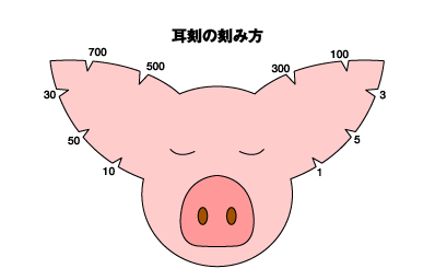 よーく見ると違った顔に見えるかも知れませんが、どの豚を見ても同じ顔に見えます。そこで、子豚の時に個体識別のための耳標(耳につける番号や記号が付いた金属製やプラスチック製の一種のピアス)を付けたり、耳刻(耳たぶに個体ナンバーの切込みを入れる)を刻んだりします。こうすることによって個体識別が可能となり、生年月日や両親の情報なども分かります。