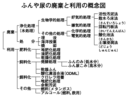 堆肥(たいひ)化処理、液肥化処理、乾燥化処理などがあり、園芸店などで堆肥や乾燥ふんとして買うことができますが、液肥は草地などへの利用が一般的です。