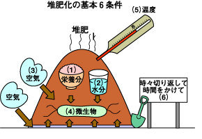 堆肥化とは、適正に制御された条件下で微生物が家畜ふん中の有機物を好気的に分解・変化させて、悪臭の少ない良質な有機質肥料を生産することと定義されています。実際には、家畜ふんや敷料(オガクズやワラのことで、豚がいる床に敷くこともあります)の通気性を良好にし、ふん中にいる好気性高温菌の働きを活発にし、原料の温度を高く、長く保持することにより堆肥化が可能となります。