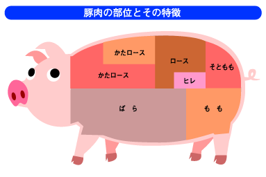 胸から腰にかけての背側の肉で、きめが細かくて柔らかい高級部位です。脂肪も適度に含むのでとんかつやポークソテーにむいています。加工品として、日本特有のロースハムの原料にもされます。 |