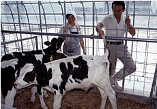 身長を測ってもらっているところ。生まれて3年たつと、やっと大人の牛としてのからだができてくるんだよ。