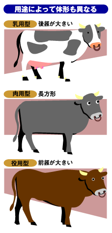 乳用牛の最大の特徴はよく発達した乳房でしょう。平均的な牛であっても1日に20kg以上の牛乳を出すため、実に大きく立派な乳房を持っています。そのため、大量の乳を出すのに必要な栄養素を得るための消化器を持っています。乳用牛の消化器は肉用牛に比べてさらによく発達していて、特に消化吸収の中心をしめる第1胃は、よく発達しています。したがって、乳用牛の体型は頭から胸にかけてよりも、お腹から後肢(こうし:後ろの足のこと)にかけての方がよく発達していて、横から見ると楔形(くさびがた)をしています。