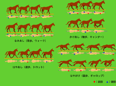 馬は歩行する際に、着地のときにかかる体重を前肢が支え、後肢が体重を前に送り出しています。また4肢の周囲に付いている沢山の筋肉を上手に使ってスムーズに歩行運動をします。