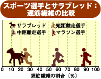 筋肉には、速く収縮できるが疲れやすい筋繊維(速筋)と、収縮速度は遅いが疲れにくい筋繊維(遅筋)の2種類あります。その比率は、普通 の人でおよそ8:2ですが、スポーツ選手は遅筋の割合がこれより少なく、スポーツ種目によっても変化します。馬の筋肉では遅筋の割合がさらに少なく、サラブレッド種は「速筋:遅筋=8.5:1.5」の割合となっています。