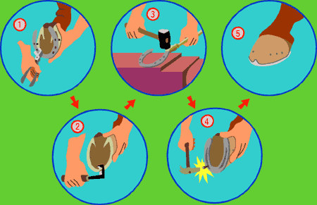 4. 専用の釘を用いて蹄鉄を蹄の下面に装着する。原則として、内外それぞれ3本ずつ合計6本の釘で固定する。