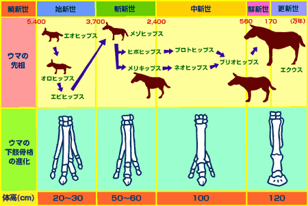 地球上に馬の祖先エオヒップスが現れたのは5400万年前の暁新世(ぎょうしんせい)から始新世(ししんせい)の頃で、体高20-30cm、1肢に4本の指(趾)を持った大型の犬くらいの大きさの動物でした。それが、弱肉強食が適用される厳しい自然のなかで、イヌの祖先たち(食肉類)に追い回されているうちにカラダはだんだん大きくなり、鮮新世(せんしんせい)から更新世(こうしんせい)の頃、体高120cm、指(趾)が1本のエクウスにまで進化しました。