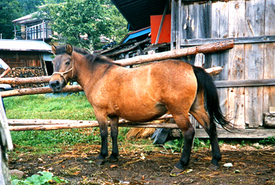 北海道和種馬と同じ南部馬の流れを汲む木曽馬の故郷は、長野県開田高原を中心とした中央アルプスの山岳地帯です。体高125-135cmのポニーで鹿毛、河原毛を主体としたやや胴長の輓馬タイプで、起伏の多い傾斜地での生活に順応したため、堅く丈夫な蹄を持ったたくましい体型です。