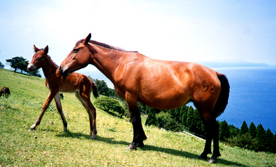 宮崎県都井岬で「日本の野生馬」のキャッチフレーズで親しまれている御崎馬は、体高が100-120cm程度の野生色のポニーです。国の天然記念物の指定を受けて約100頭の自然繁殖集団として維持され、都井岬の特異な環境(高温多湿、台風の通り道、ソテツの原生林のほか野芝を主体とした特殊な生物相)の中で観光資源として元気に遊んでいます。