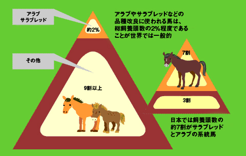 世界各国で飼われている馬の総数は約6000万頭。国によって多少のちがいはあるが、その数はほぼ安定している。1000万頭をこえる国は中国とロシアで、あとの国々は100万頭以下。サラブレッドで有名なイギリスなど、欧米の大部分の国では小さいポニーから大きな馬まで、大小さまざまな馬を飼っている。その広いすそ野に支えられた頂点に立つのが、その国を代表する品種といえる。