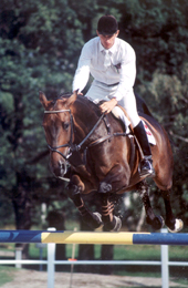障害飛越は、騎乗した選手が、スタート・ラインとゴール・ラインの間に高さと幅が異なる数個の障害物(バー、障壁、ダブル・トリプル、水濠など)をいろいろな間隔、向きで配置した規定コースを走る競技です。通過時間(スピード)と、拒否(スムースに越えたかどうか)、落下させた障害物の個数を減点法によって評価して成績を競います。飛越する障害の高さによって、中障害(110〜140cm程度)と大障害(150〜160cm程度)に区別しています。
