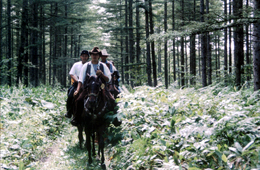 天気のよい日に広い原野を馬に乗って自由に走り回ると、目に入る緑の広々とした風景、梢や草を揺らす風や、リズミカルなヒヅメの音が耳に入り、すがすがしい空気の香りが鼻をくすぐります。そんなホース・トレッキングは、忙しい日常を忘れ、森林浴をしながら自然と親しみ、しかも家族一緒に楽しめる新しいレジャーです。また、自然の観察、馬とのコミュニケーション、馬や他人に対する優しい心遣いなど、社会問題となっている現代人の心の欠陥をいつの間にか癒してくれる効果もあり、注目されています。